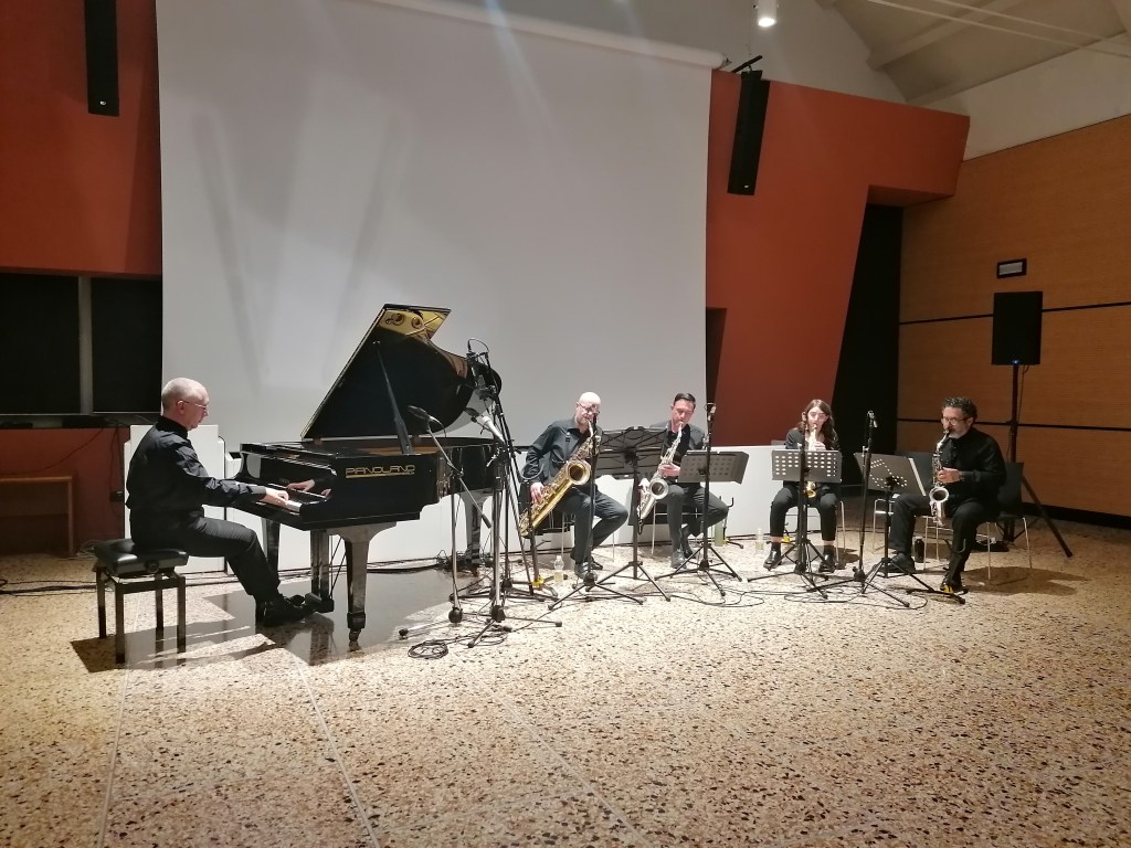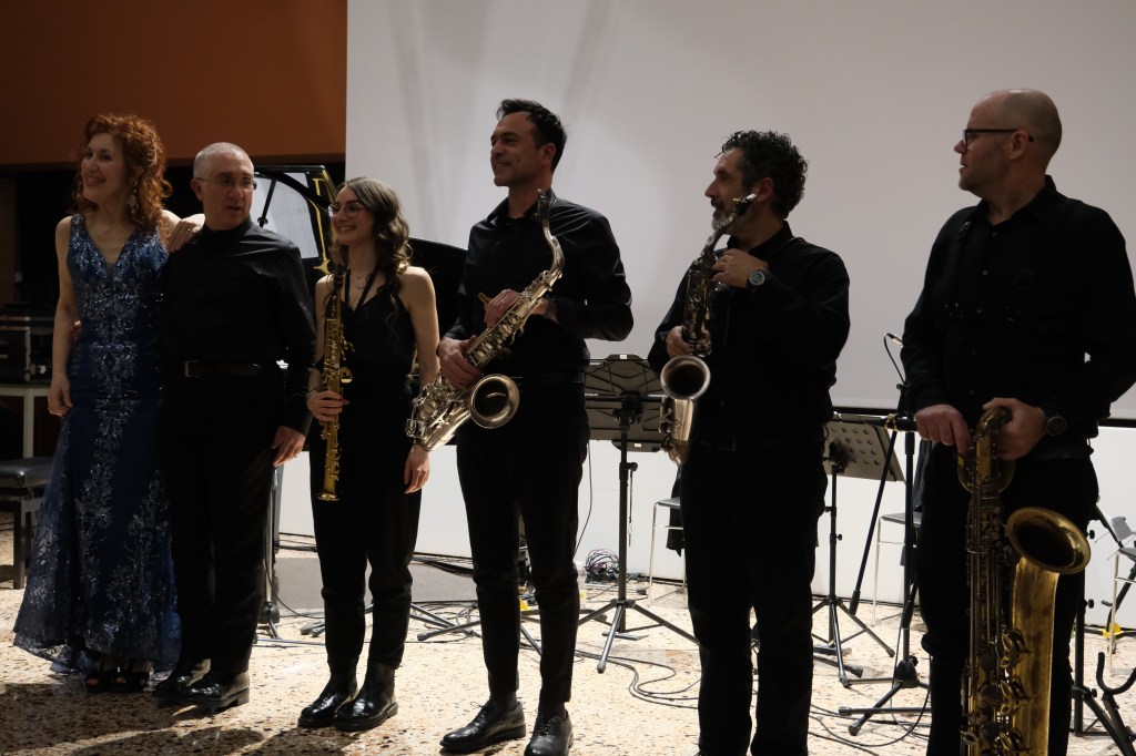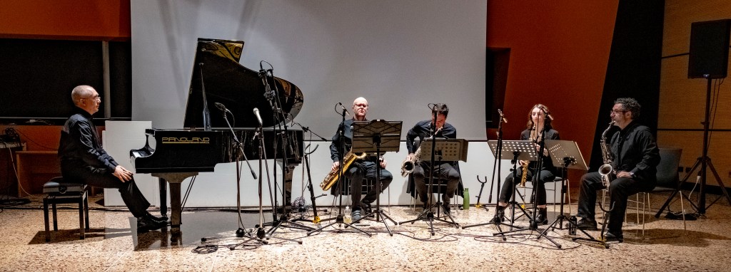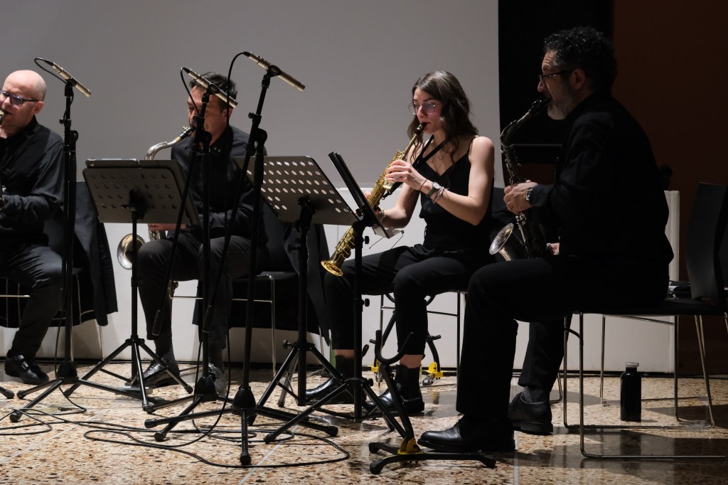 accompagnato da Zoe Turci al sax soprano, Simone Valla al sax contralto, Giuliano Nora al sax tenore e