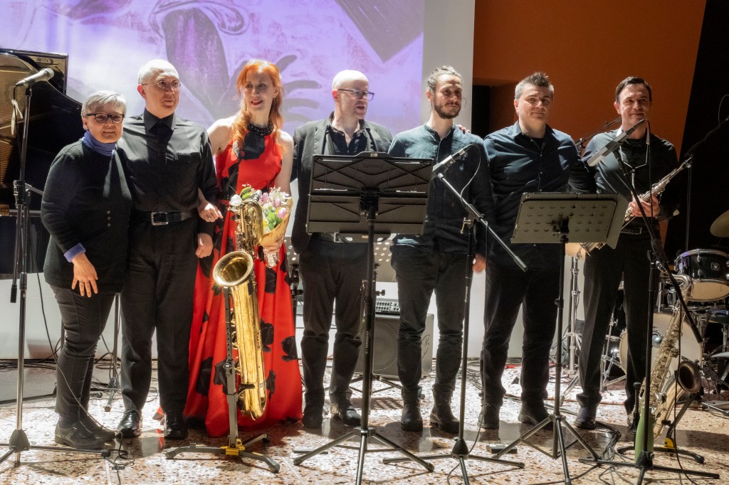 Lo storico gruppo “aperto” Armonya Nova Ensemble, che oltre vent’anni accompagna il musicista, con Laura Biolcati Rinaldi alla voce e Giuliano Nora e Davide Vicari ai saxofoni, si è arricchito per l’occasione della sezione ritmica composta da Simone Di Benedetto al basso e Marco Carnevali alla batteria, conferendo ai brani nuove sonorità e possibilità stilistiche, e una commistione sempre più stretta fra musica classica e jazz. I “nuovi intrecci sonori”, filo conduttore del concerto, hanno spaziato dai brani per pianoforte solo, alla musica vocale per musical, ai concerti per saxofono.