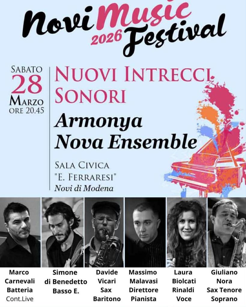 Si è conclusa il 28 marzo con il concerto di Massimo Malavasi e Armonya Nova Ensemble la quarta edizione del Novi Music Festival, evento organizzato dal Comune di Novi di Modena con il prezioso contributo della Fondazione Cassa di Risparmio di Carpi, che dal 2023 offre, a cavallo del mese di marzo, un ciclo di concerti gratuiti nei principali spazi del territorio. La rassegna si è caratterizzata ancora una volta per la partecipazione del pubblico, che ha affollato tutti gli eventi in programma, dimostrando l’apprezzamento per una formula che si distingue per la qualità degli esecutori e la varietà dei generi musicali proposti.